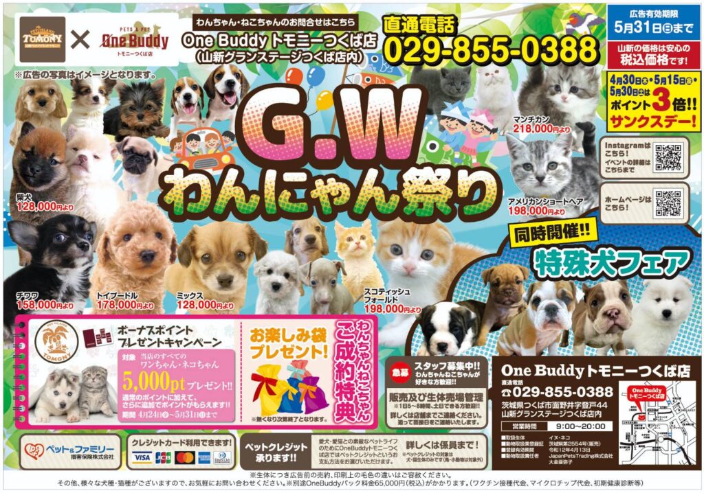 OneBuddyトモニーつくば店はGWわんにゃん祭りを開催中!!